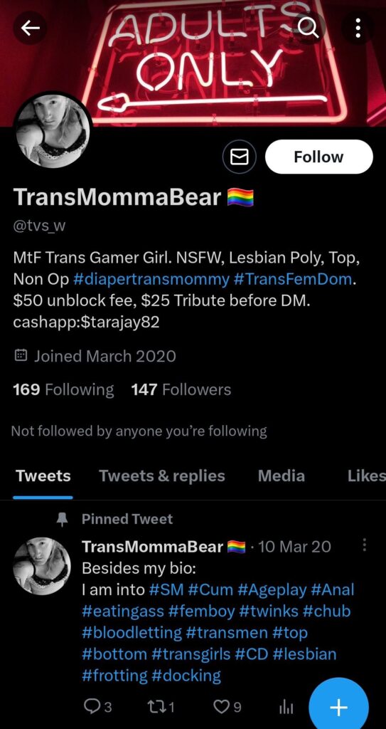 “On his 18+ Twitter account he talks about he is in to “diapers” and “age-play” as well as “blood” play- meaning he is aroused by using violence against women and dressing as a child as part of his fetish.”
