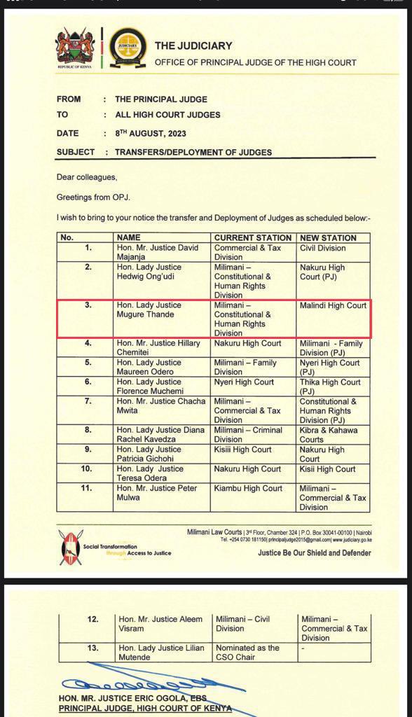 Lady JUSTICE Mugure Thande has been transferred from Nairobi to Malindi days after making a landmark Ruling suspending the Poisonous Finance Act, 2023.