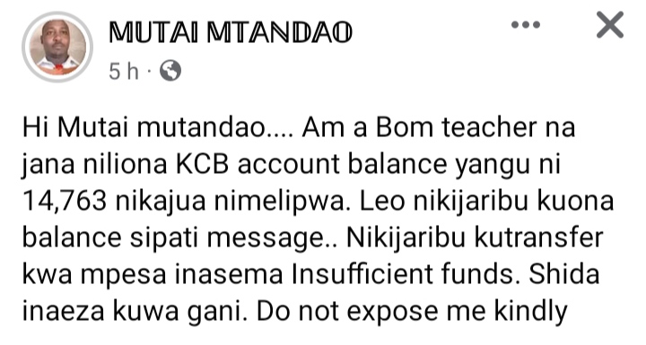 “Hi Mutai mutandao…. Am a Bom teacher na jana niliona KCB account balance yangu ni 14,763 nikajua nimelipwa. Leo nikijaribu kuona balance sipati message.. Nikijaribu kutransfer kwa mpesa inasema Insufficient funds. Shida inaeza kuwa gani. Do not expose me kindly” Said the Man according to Mutahi Mutandao.